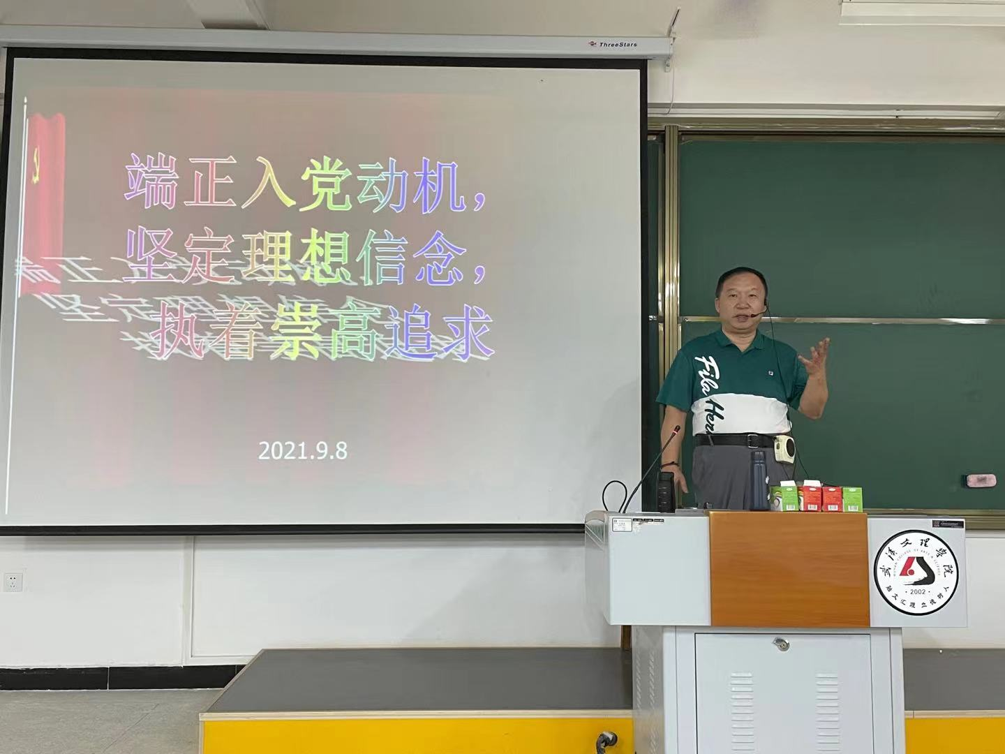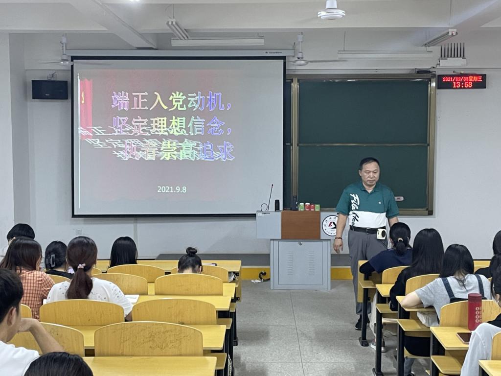 9月8日yl23455永利教师党支部书记徐江老师,在院内开展了一次“端正入党动机、坚定理想信念、执着崇高追求”为主题的党课宣讲活动。徐老师详细罗列不良入党动机类型,让同学们对照自身发现问题;讲述优秀党员事迹,树立学习榜样;介绍党的优良传统,指明学习方向。所有在校学生党员、部分重点发展对象和部分积极分子等100名余同学参加了活动。