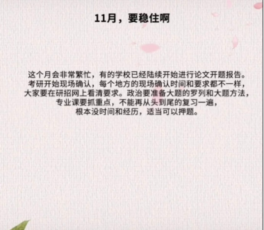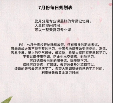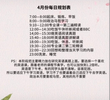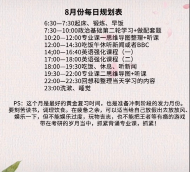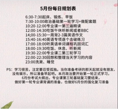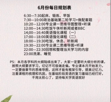 这也是⾮常重要的⼀点。⼤家都是第⼀次考研,考研和我们所经历的所有考试都不同,需要我们准备的时间太⻓了,因此我们需要制定学习计划。注意,我说的计划是详细的,⽉计划、周计划和每天的计划。⼤家可以在⽹上买那种考研计划本,把每天要学习的内容和时⻓、总结写下来。