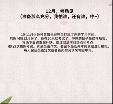 另外⼀点特别重要的是,研究你所报考院校的历年真题,越详细越全⾯越好。真题考过的、重复率⾼的题,⼀定得背诵。最好能够⾃⼰摸索出出题的规律,有效地筛选出不必要的考点。