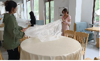 在餐厅里,同学们帮助餐厅厨房阿姨摆盘子、收餐布、铺餐布、拖地等日常帮厨工作。真正体验到阿姨们劳动的辛苦,大家纷纷表示在今后的生活中尊重和珍惜餐厅工作人员的劳作成果,不浪费食物,不乱丢垃圾。