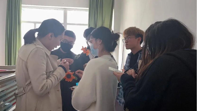 活动开始时,心协的成员在杨洁书记引导下,由会长们将成员们亲手制作的向日葵和郁金香送给各位老师,贴上最独特的“姓名藏头诗”,并对各位老师说一句“您辛苦啦”。师生们脸上都洋溢着喜悦的笑容,办公室的走廊上充满了欢声笑语,同学们和老师们都感受到了这份节日的温暖。