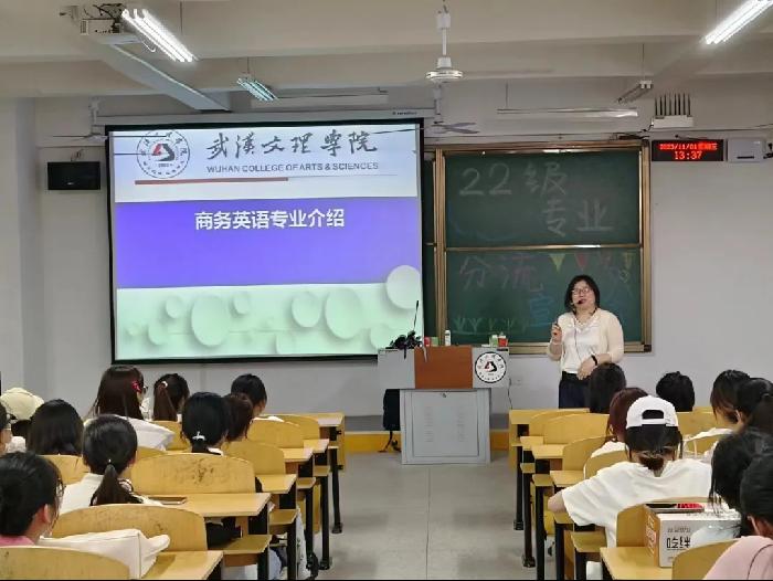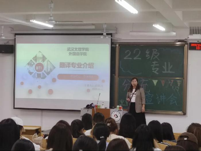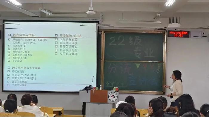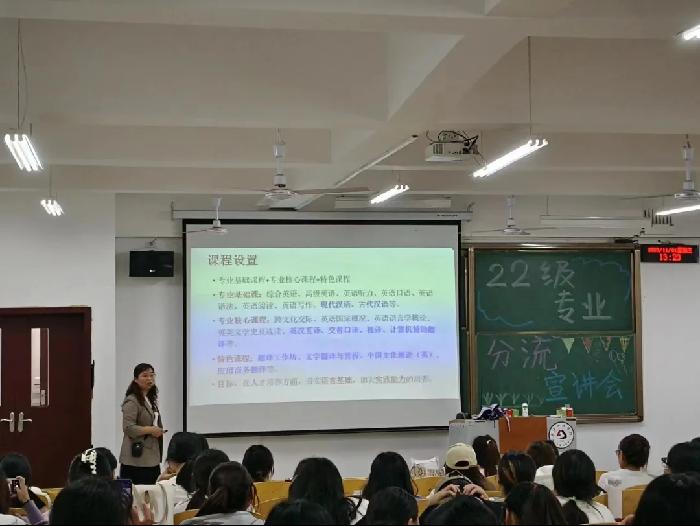 为了落实立德树人的根本任务,扎实学院专业建设,帮助2022级的同学充分了解各专业不同之处。yl23455永利于11月1日召开专业分流宣讲会,本次会议由yl23455永利教学副院长徐江老师、翻译系主任黄群丹老师、商务英语系主任刘俊老师主讲,辅导员周雅君老师和2022级全体同学参与。