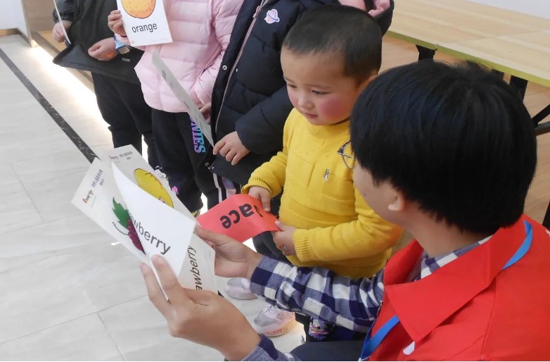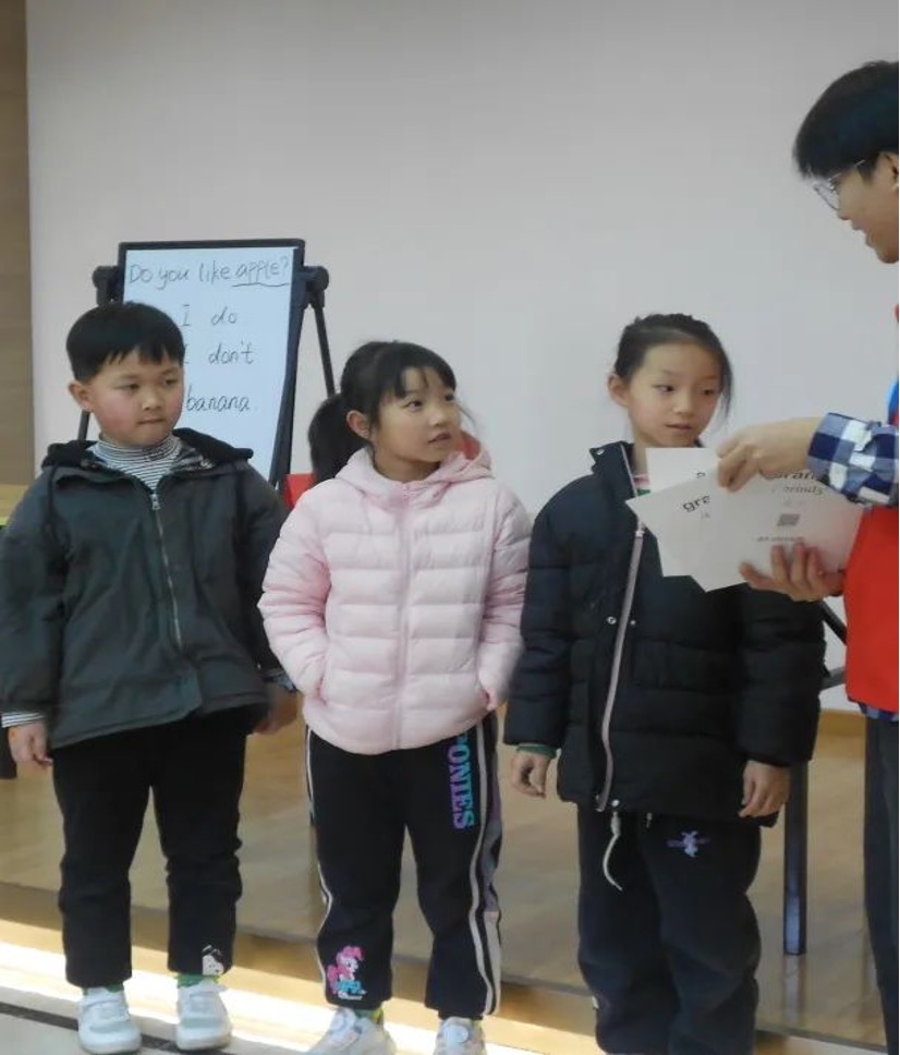 上课前,王锦老师和郑燕老师分别发放英语名卡片,让小朋友拥有自己的英文名字。他们带着小朋友进行学习前的热身活动,听着美妙的英语歌曲,进入有趣的英语课堂。随后王锦老师对小朋友们进行水果类单词的教学,教小朋友在生活中如何用英语表达自己喜欢的水果。为了巩固小朋友们对单词的熟练程度,王锦老师与小朋友以英语对话的形式进行买卖水果的游戏,让小朋友们在游戏中复习学过的知识,加深对单词的印象。