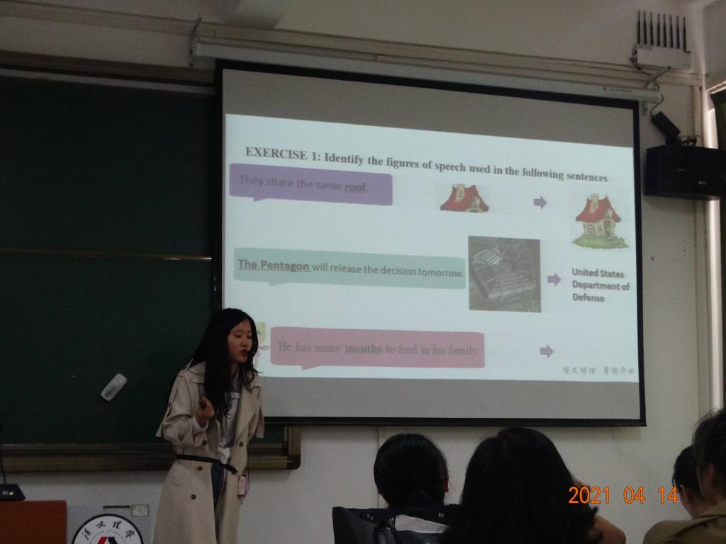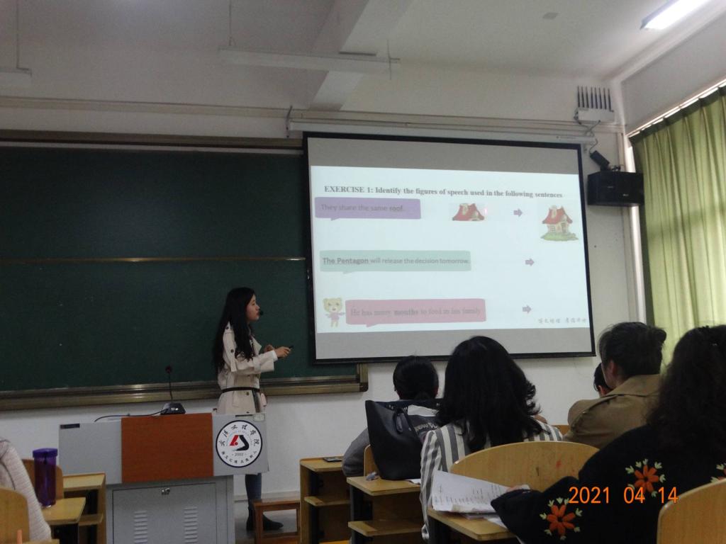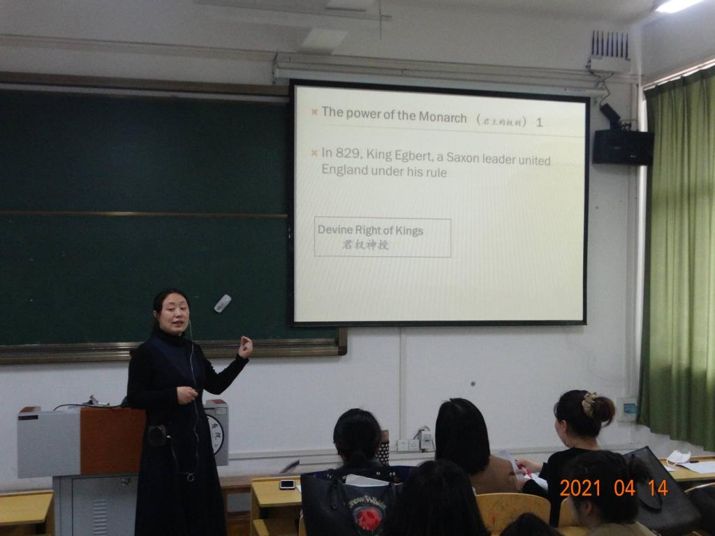 为推进及优化课堂教学,有效评估教师的课堂教学效果,促进我院教师的专业成长,yl23455永利于2021年4月14日在5栋教学楼213教室举办了一场教师讲课比赛。在这次讲课比赛中,共有12名教师参与比赛,其中英语系派出了王慧和汪玲两位老师。根据赛制规定,每位老师的比赛时间为15分钟,包括说课和讲课两个环节,我系的王慧老师的主题为“British Monarch”,汪玲老师的主题为“Figures of Speech”。两位教师凭借着扎实的基本功,生动的课堂效果赢得了评委和教师们的一致好评,最终顺利进入决赛。