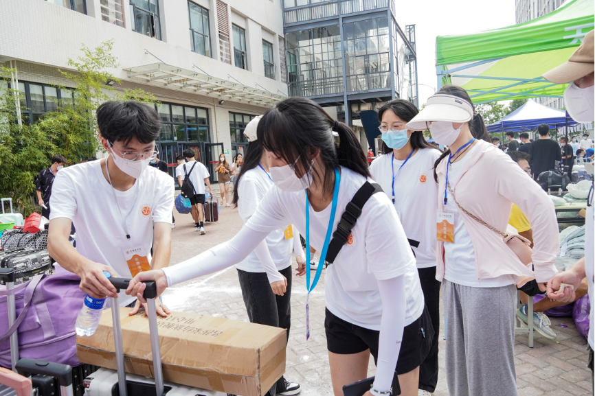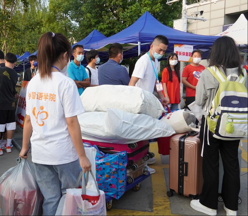 在校门外,yl23455永利集团派出摆渡车接送新同学,外院的朱一雷老师也带领志愿者们在校门口迎接新生。由于疫情,学生随行的家长们不能进校,于是团委主席熊武强学长奔赴迎新第一站,带领外院志愿者团队,帮助新生寄存、搬运厚重的行李,大到被褥和拖箱,小到盆桶,一箱牛奶。今天的志愿者们,奔跑在校园的路上尽心尽力地为新生服务,挥洒汗水。