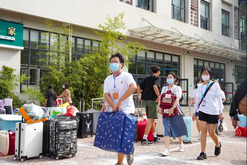 在完成校外资料核查后,学长学姐们其中一人引导新生报到,其余人便帮助新同学将行李运送至校内食堂站寄存点。温暖的阳光照耀在志愿者们的背影上,在初秋的早上点亮橙色的光芒。