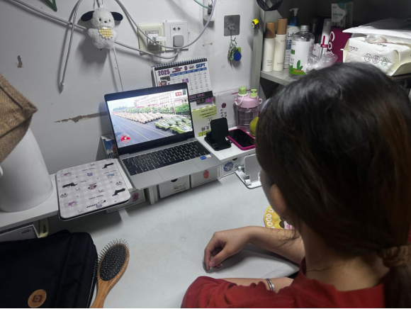 针对部分因实习、课程无法到场的学生,学院通过腾讯会议、微信公众号等平台开通“云端观礼”通道。学生们通过在寝室、图书馆等地同步收看。“当看到那象征着14年抗战历程的年号台和和平鸽时,我仿佛看到了那段艰苦卓绝的岁月。我们要铭记历史,珍惜现在的和平生活,努力学习,为实现中华民族伟大复兴而奋斗。”外语专业2024级徐雯竞同学写到。