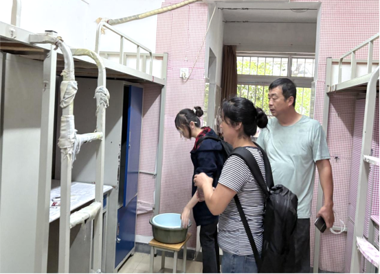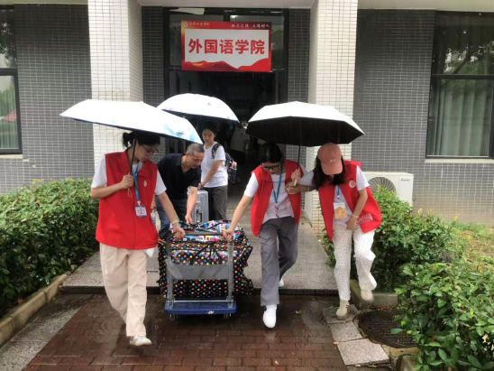 新生办完手续后,学长学姐们立刻化身“暖心引路人”,主动接过行李,带领新生及家长前往宿舍。途中,他们耐心介绍教学楼、食堂、图书馆等校园设施,用贴心讲解让新生与家长切实感受到外院大家庭的温暖与关怀。