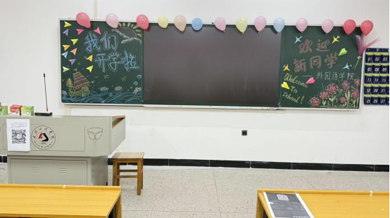 迎新工作启动前一天,工作人员与志愿者提前悬挂起“外院欢迎新同学”的横幅,在黑板上画好迎新板报,用气球点缀现场,让报到点既整洁规范又充满人文温度。与此同时,学院书记、辅导员与志愿者们细致核查物资、梳理流程,全力做好迎新准备。