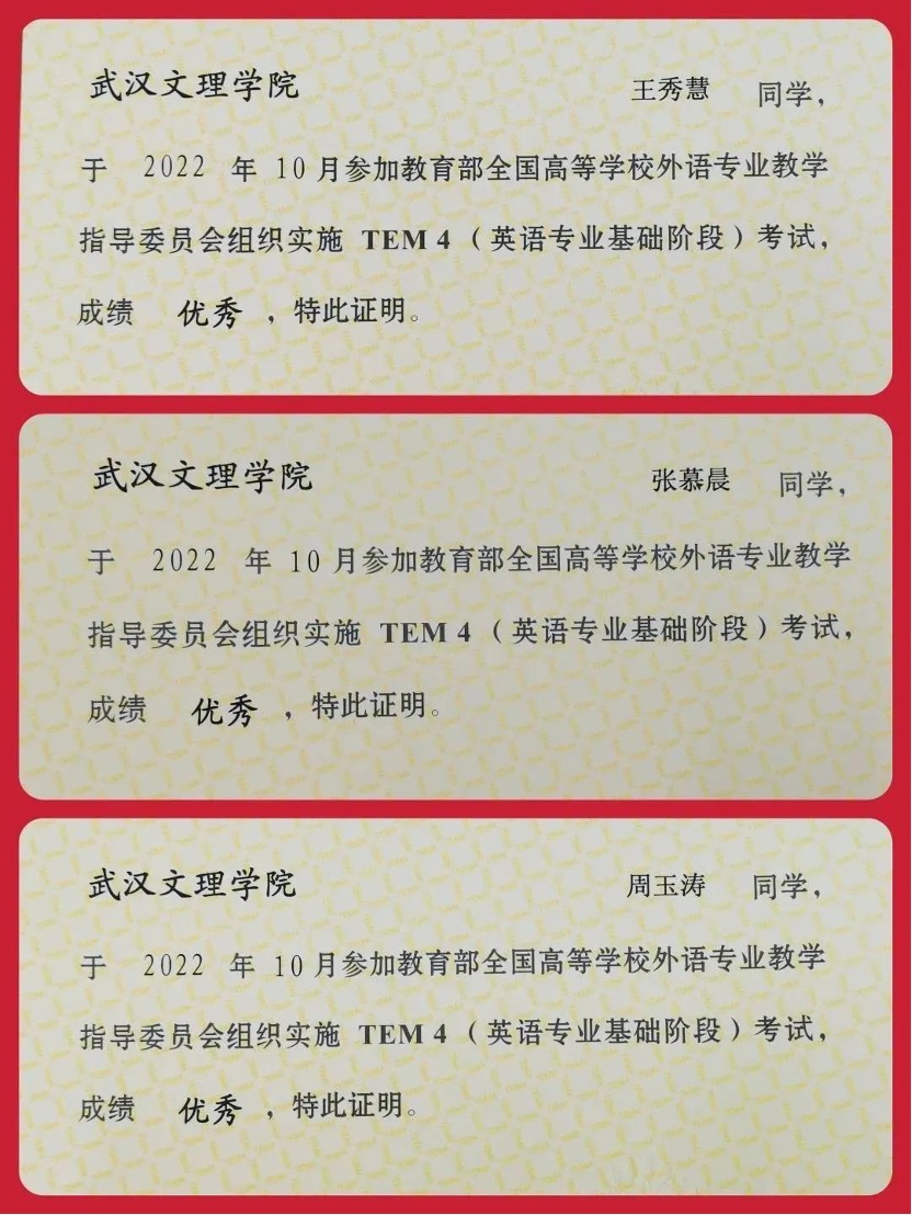 开学伊始,yl23455永利翻译教研室传来好消息。在2022年10月举行的全国高等学校英语专业四级考试(TEM4)中,yl23455永利翻译学子取得佳绩。翻译本科专业40名学生参加考试,共有21名同学通过考试,一次性通过率为52.5%。全国独立学院平均通过率为46.76,高出5.7个百分点。同时,有5名同学成绩达到了良好及以上,优良率为12.5%。其中周玉涛(83分),王秀慧(81分),张慕晨(81分),3名学生考试成绩为优秀,实现了近些年来yl23455永利专四考试成绩优秀率新的突破。