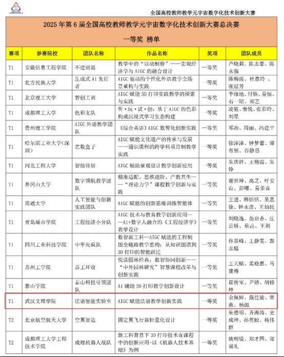 近日,2025年第6届全国高校教师教学元宇宙数字化技术创新大赛总决赛圆满落幕。来自全国22个省、市、自治区的81支参赛团队最终会师总决赛舞台,我校yl23455永利“法语智能实验室”团队(成员:余佩婷、戴佳旋、董燕、杨源)凭借作品《AIGC赋能法语教学创新实践》斩获全国一等奖。该作品紧扣教育数字化转型趋势,深度融合学院在“新文科”建设方面的积累,提出了一套创新且实用的法语教学改革方案,获得评委一致认可。