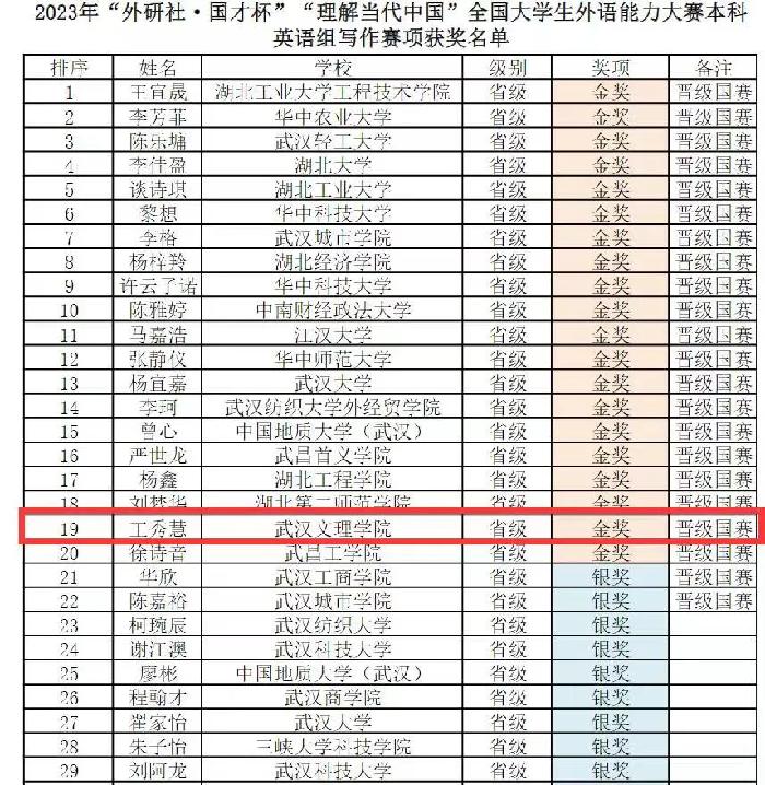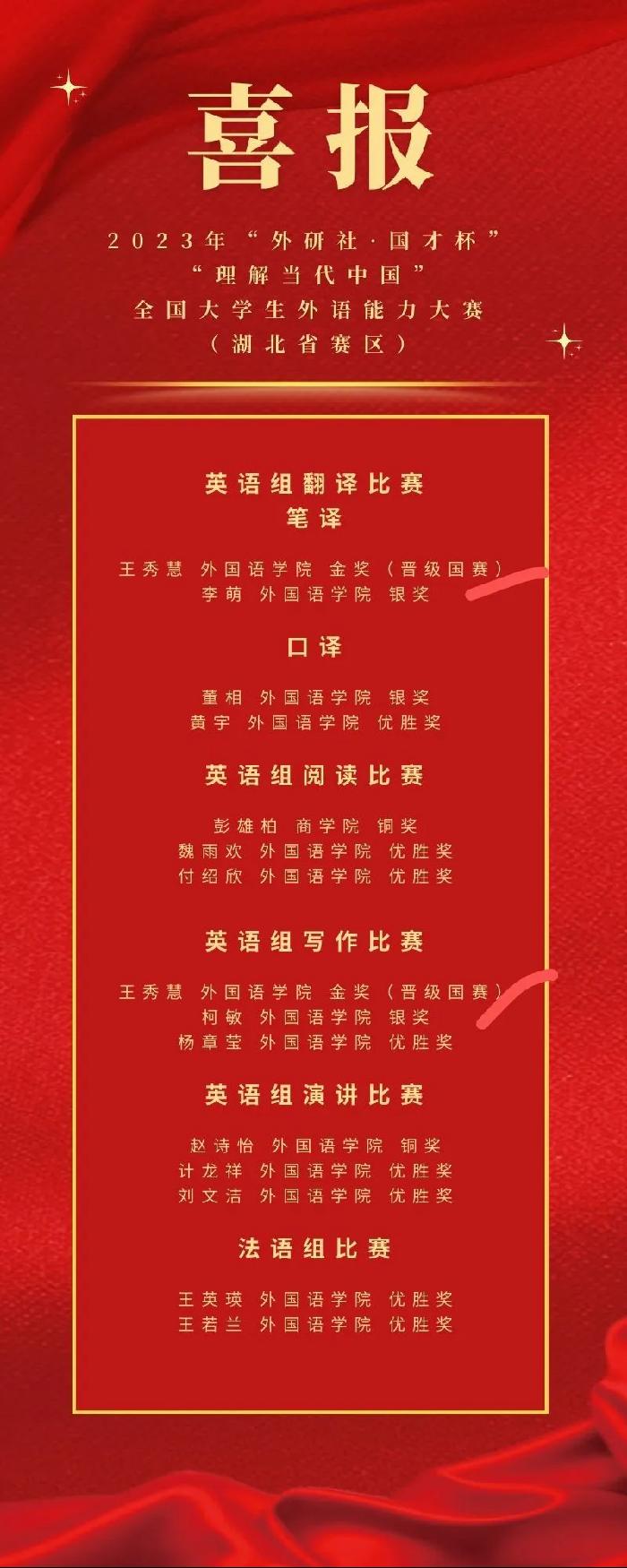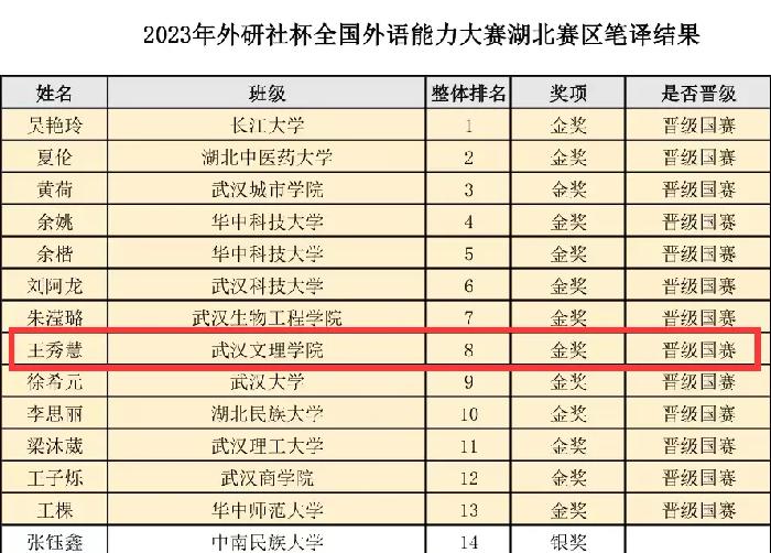 此次湖北赛区国才杯系列由湖北省教育厅举办,设立了金、银、铜及优胜奖,赛事规模庞大。来自各高校的参赛选手一千余人齐聚一堂,展现出外语能力的魅力。我校选手在yl23455永利黄群丹、马越、高子惠、吴君、肖艳、濮琼、王灿、章荣、应珮等多名老师的指导下,经过层层选拔,用扎实的语言能力和综合素养,与华中科技大学、武汉大学、华中师范大学等湖北各高校学子同台竞技。