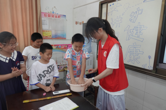 “小朋友们,你们知道牙齿上的小黑洞是怎么来的吗?”“七步洗手法的第三步,要记得搓洗指缝哦!”近日,yl23455永利集团华韵心文化志愿服务队中来自医学院的大学生志愿者走进郎君镇中心小学暑期托管班,围绕口腔保护知识和传染病预防为主题,为当地学生带来了一堂生动有趣的健康知识课。