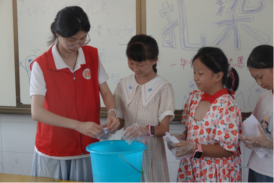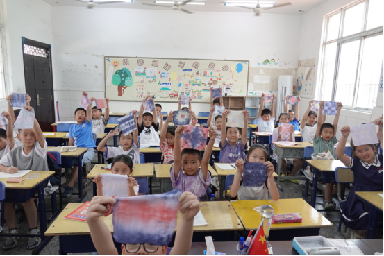 板蓝根的叶子能萃出沉静的蓝,栀子花的果实能酿出明亮的黄……这些都是大自然藏在植物里的色彩魔法。课堂上,志愿者认真地演示扎染步骤,生动的讲解配上千年传承的故事,让孩子们眼中满是好奇。