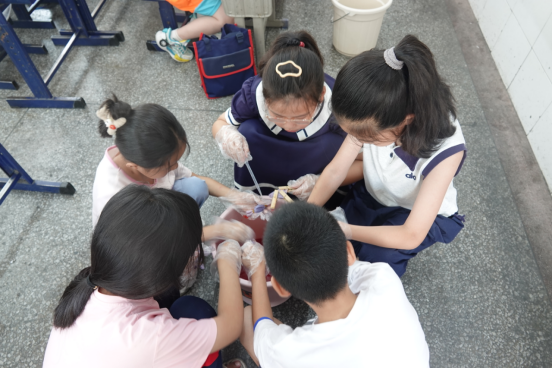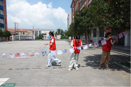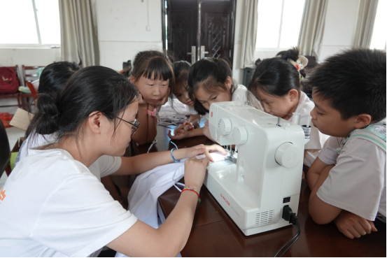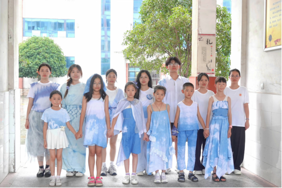 更令人期待的是制作扎染服装的环节。部分孩子们跟着志愿者学裁布、学缝制。通过一周努力,孩子们与志愿者们在教学楼道里迈着小步子展示制作成果,稚嫩的身影与扎染服饰相映成趣。这不仅是一场童趣走秀,更是一次非遗与生活的亲密接触,本次课程增加对实用性的转化,孩子们触摸的是柔软布料,感受的是千年工艺的温度;缝制的是简单服饰,连接的是传统与当下的文化脉络。原本的古老工艺,如今成了孩子们可感、可玩、可创造的生活艺术,这种“接地气”的传承让千年技艺有了孩子气的表达。