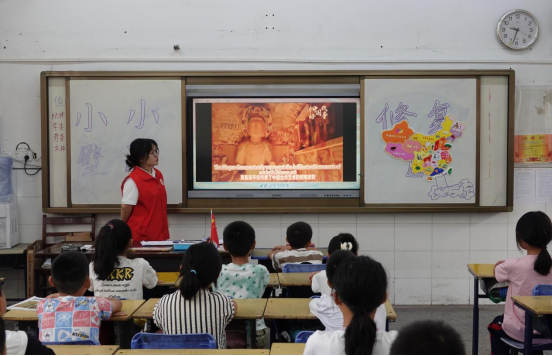 在播放的纪录片中,莫高窟内的壁画、鸣沙山的流沙似有若无地“飘”进教室,孩子们的惊叹声此起彼伏。“这些画好特别呀!”一名学生指着屏幕小声说。志愿者笑着回应:“这是敦煌壁画,是我们祖先留下的宝贝。”在孩子们心中,壁画的印记悄然刻入心间。